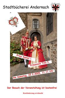 Es ist wieder soweit. Am Samstag, den 22.02.2025 um 11:11 Uhr besucht das Andernacher Prinzenpaar mit dem gesamten Hofstaat die Stadtbücherei und liest allen kleinen und großen Närrinen und Narren lustige Geschichten vor. Nach dem Vorlesen könnt ihr dem Prinzen und der Prinzessin auch gerne ein paar Fragen stellen. Das Team der Bücherei freut sich auf viele bunt verkleidete Kinder. Der Besuch der Veranstaltung ist kostenfrei.