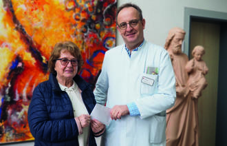 Kassiererin Helma Knoche überreicht die Spende der Evangelischen Frauen im Rheinland an den Leitenden Arzt Dr. Thomas Dyong.