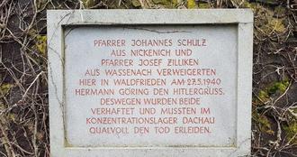 Am Restaurant „Waldfrieden“ erinnert eine Gedenktafel an die Pfarrer Josef Zilliken und Johannes Schulz, die im Konzentrationslager Dachau umkamen.