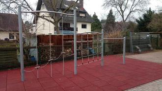 So können die Grundschulkinder in den Pausenzeiten sowie vor und nach dem Unterricht nach Belieben über Seile, Brücken und Pfähle balancieren, sich an Netzen hochhangeln und Stufen erklimmen.
