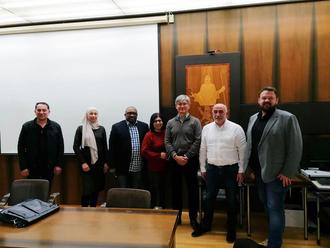 (v.l.n.r.): Ali Edries, Kaddour El-Houaria, Benedikt Aimionowane, Beigeordnete Zeynep Begen, Eduard Merker (Caritas), Hüseyin Ocar (AWO) und Bürgermeister Christoph Mohr.