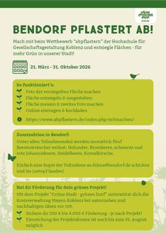 Bendorf. Die Stadt Bendorf ruft in diesem Jahr zur Teilnahme am bundesweiten Wettbewerb „abpflastern“ auf. Ziel der Aktion der Hochschule für Gesellschaftsgestaltung Koblenz ist es, versiegelte Flächen zu entsiegeln und so einen Beitrag zu mehr Grün, besserem Mikroklima und erhöhter Lebensqualität zu leisten. Der Wettbewerbszeitraum läuft vom 21. März bis zum 31. Oktober.