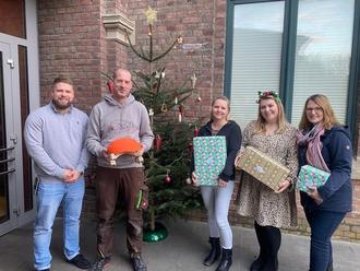 Bescherung im HadeKi: (v.l.n.r.) Kita-Leitung Dominik Knoll, Matthias Wöller, Nina Killian, Tabea Breil und Sabrina Schmidt vom Förderverein.