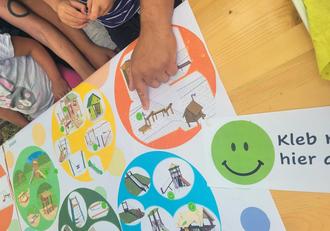Auf bunt gestalteten Plakaten wurden verschiedene Spielgeräte vorgestellt, darunter Rutschen, Kletter- und Balanciermöglichkeiten. Mit grünen Smiley-Klebepunkten konnten die Kinder ihre Lieblingsgeräte markieren. Diese Art der Beteiligung kam sehr gut an – es wurde diskutiert, gelacht und begeistert geklebt.