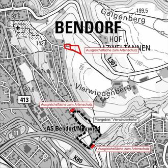 Darüber hinaus werden im Rahmen der vorliegenden Aufstellung des Bebauungsplanes auf externen Flächen erforderliche Maßnahmen zum Artenschutz umgesetzt. Die externen Ausgleichsflächen liegen in der Gemarkung Bendorf, Flur 5 Flurstücke 247/20 und 362/8 sowie Flur 6, Flurstücke 288/1 und 292/2.