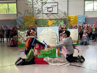 Zusammen mit ihren Klassenlehrerinnen probten fast 100 Schüler und Schülerinnen mehrere Wochen lang für dieses Ereignis. In dem Sing- und Tanzspiel erzählten sie die Geschichte eines Vogelmännchens, das sich zur Paarungszeit ein Weibchen sucht und mit diesem ein Nest baut, um darin ein Vogelei auszubrüten und dann das gemeinsame Vogelbaby groß zu ziehen.