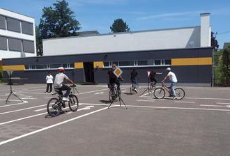 Im Anschluss ging es auf den Schulhof der Theodor-Heuss-Schule, wo ein abwechslungsreicher Fahrradparcours aufgebaut war. Dort konnten die Teilnehmenden das Erlernte direkt anwenden: Anfahren, Hindernisse umfahren, Schulterblick - unter fachkundiger Anleitung wurden realistische Situationen geübt, die im Straßenverkehr jederzeit auftreten können.