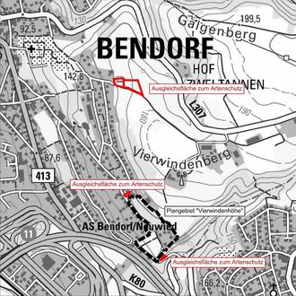 Darüber hinaus werden im Rahmen der vorliegenden Aufstellung des Bebauungsplanes auf externen Flächen erforderliche Maßnahmen zum Artenschutz umgesetzt. Die externen Ausgleichsflächen liegen in der Gemarkung Bendorf, Flur 5 Flurstücke 247/20 und 362/8 sowie Flur 6, Flurstücke 288/1 und 292/2. Die Lage der externen Ausgleichsflächen kann dem beigefügten Übersichtsplan entnommen werden.