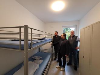 (v.l.n.r.): Bürgermeister Christoph Mohr, Erster Kreisbeigeordneter Pascal Badziong und Erster Beigeordneter der Stadt Peter Schneider bei der Besichtigung der neuen Unterkunft.