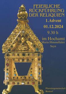 Die alte Abteikirche Maria Himmelfahrt in Sayn ist reich gesegnet mit Reliquien, besonders mit der Reliquie des Hl. Apostels Simon, dem frühchristlichen Märtyrer Pius und der Armreliquie der Hl. Elisabeth (Schloßkapelle). Nach den umfangreichen Renovierungsarbeiten im Chorraum, werden die Reliquien nun feierlich am 1. Advent im Hochamt um 9.30 h zurückgeführt und der Hochaltar damit wieder geöffnet. Herzliche Einladung zu diesem Festgottesdienst in der Abteikirche Maria Himmelfahrt/Sayn!
