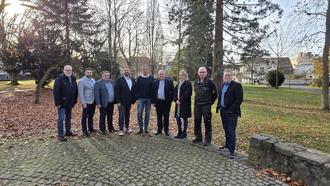 Austausch zu den Parkprojekten: (v.l.n.r.): Erster Beigeordneter Peter Schneider, Jurij Kukulka, Ruslan Shyshka, Bürgermeister Christoph Mohr, Thomas Gutfrucht, Yaroslaw Tsaryk, Olga Wagner, Michael Schneider, Stefan Groß.