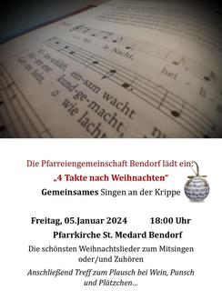 | St. Medard | 18.00 h | „4 Takte nach Weihnachten“ Gemeinsames Singen an der Krippe |