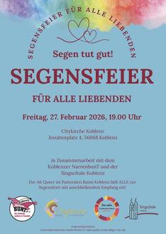 Der Arbeitskreis Queer im Pastoralen Raum Koblenz veranstaltet am 27.02.2026, 19:00 Uhr, bereits zum dritten Mal die Segensfeier für alle Liebenden in der City-Kirche in Koblenz. Egal ob Paare, Singles, beste Freund*innen oder alle anderen Liebenden - Segen tut gut und wir freuen uns über jede*n Besucher*in.