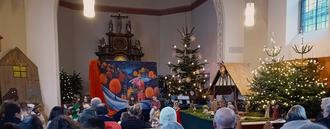Foto zeigt: Festlich geschmückte Pfarrkirche "St. Petrus" Trimbs beim Krippenspiel "Der kleine Trommler" am Heiligen Abend 2024