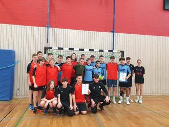 Die Handballer der IGS Maifeld (rote Trikots) haben in der „Wettkampfklasse II Jungen“ beim Regionalentscheid des Wettbewerbs "Jugend trainiert für Olympia" den zweiten Platz belegt. Auch die mitbetreuende Sportlehrerin Lara Weinand freut sich über diesen Erfolg.