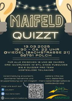 Das „Maifeld quizzt" heißt es am Donnerstag, den 13.03. von 19:30 bis ca. 22 Uhr im Sozialgebäude @Viedel, Bachstraße 21 in Polch. Eingeladen sind alle zwischen 16 und 99 Jahren. Gespielt werden drei Runden im Stil eines Pubquizes. Pro Team können bis zu sechs Leute aktiv sein. Eine Voranmeldung wird gewünscht, aber auch die spontane Teilnahme mit Gruppenbildung vor Ort ist möglich. Ganze Teams aber auch Einzelpersonen können mitmachen. Die Teilnahme ist kostenlos!