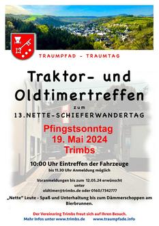 Im Rahmen des 13. Nette-Schieferwandertags am Pfingstsonntag 19. Mai 2024, in Trimbs findet erneut ein Traktor- und Oldtimertreffen statt. Wer gerne seinen Traktor oder Oldtimer präsentieren möchte, sollte sich bis zum 12. Mai unter oldtimer@trimbs.de oder 0160/7342777 voranmelden.