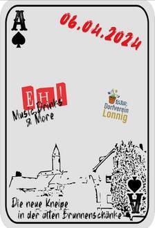 Da fragt dich keiner was du hast oder bist. Durch die positiven Resonanz und dem großartigen Feedback der ersten Veranstaltung in der kleinen Kneipe, möchten herzlich zum zweiten Kneipenabend am 06.04.2024 in die Brunnenschänke einladen. Freut euch auf leckere Getränke, eine gemütliche Atmosphäre und nette Gesellschaft. Der Dorfverein Lonnig und das EH-Team freuen sich schon jetzt darauf, euch wieder begrüßen zu dürfen!
