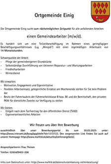 Die Ortsgemeinde Einig sucht zum nächstmöglichen Zeitpunkt für alle anfallenden Arbeiten