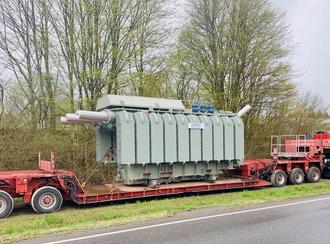 Schwertransport eines neuen Hochleistungstransformators zur Umspannanlage.
