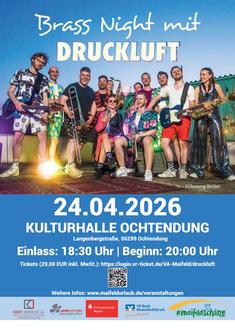 Am 24. April wird Ochtendung zum Treffpunkt für alle Fans energiegeladener Live-Musik: Bei der „Brass Night“ sorgt die Brass-Band DRUCKLUFT für ein Konzerterlebnis, das weit über klassische Blasmusik hinausgeht. Die Band, die vielen vor allem aus dem Karneval bekannt ist, zeigt an diesem Abend ihre gesamte musikalische Bandbreite – und hat dabei einige Überraschungen im Gepäck.