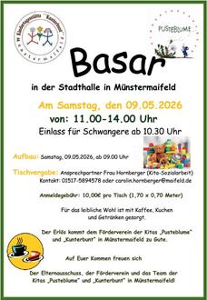 Am Samstag, den 09.05.2026 ist es soweit: Von 11:00 - 14:00 Uhr (für Schwangere ab 10:30 Uhr) lädt ein Basar der Kitas Kunterbunt und Pusteblume in der Stadthalle in Münstermaifeld zum Stöbern und Entdecken ein.
