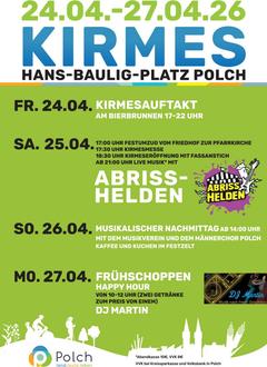 Am Samstag öffnet der Kirmesplatz bereits am Mittag seine Tore. Um 17 Uhr gedenken wir gemeinsam der Verstorbenen auf dem Friedhof, bevor ein festlicher Umzug der ortsansässigen Vereine zur Kirche geht, wo die traditionelle Kirmesmesse stattfindet. Im Anschluss lädt die Stadt Polch zum traditionellen Fassanstich im Festzelt ein.