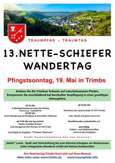 der Vereinsring und die Ortsgemeinde Trimbs organisieren am Pfingstsonntag, 19. Mai 2024, den 13. Nette-Schiefer Wandertag in Verbindung mit einem Traktor- und Oldtimertreffen.