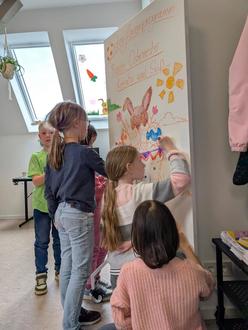 Den Auftakt machte eine unserer beliebten Bastelaktionen rund um das Thema „Ostern“. Beim Gestalten der bunten und süßen Osternester bemalten die Kinder zuerst kleine Tontöpfe mit bunter Acrylfarbe. Bunt, kreativ und mit viel Freude wurden die Osternester gestaltet, liebevoll mit Ostergras und leckeren Süßigkeiten gefüllt und mit nach Hause genommen. Auch beim Basteln der farbenfrohen Osterfensterbildern waren die Kids mit Begeisterung und Konzentration dabei. Die Nachfrage war erneut so groß, sodass die Aktion kurzerhand in zwei Gruppen organisiert werden musste. Mit buntem Papier, Kleber, Schere und etwas Geduld entstanden wunderschöne Fensterbilder mit Eiern, Hasen, Möhren, Blumen und vielen anderen österlichen Motiven.