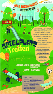 die Kita-Sozialarbeiterinnen der Verbandsgemeinde Maifeld laden am Mittwoch, 19.06.2024 von 14 bis 16 Uhr zum Spielplatztreff an unserem Bürgerhaus in Gierschnach ein. Der offene Spielplatztreff für Familien mit Kindern bietet eine schöne Gelegenheit für Spaß, Begegnung und Austausch sowohl mit anderen Familien als auch mit den Sozialarbeiterinnen.