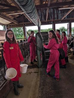 Nach einer herzlichen Begrüßung durch Bauernhofpädagogin Stefanie Jung und einer kurzen Einführung in die Hofregeln, ging es nach dem Mittagessen zu den Tieren. Nachdem sich alle die Schutzkleidung und Gummistiefel angezogen haben, wurden die Mädchen in zwei Gruppen aufgeteilt und erkundeten die verschiedenen Lehrwerkstätten. Dort warteten bereits zahlreiche Rinder darauf, die neuen Gäste zu begrüßen, gemolken und versorgt zu werden.