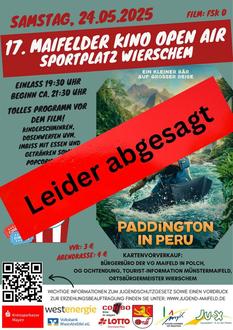 Das für den 24. Mai 2025 geplante Maifelder Kino Open Air auf dem Sportplatz in Wierschem musste kurzfristig aufgrund anhaltender Regenfälle und ungünstiger Witterungsverhältnisse abgesagt werden.