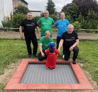 Bildunterzeile: Dieter Puth, Ortsbürgermeister Udo Heinemann, Projektpate Markus Bender (hintere Reihe von links), Alexander Wierschem und Erich Wierschem (vordere Reihe von links) freuen sich über das neue Bodentrampolin. (Foto: Westenergie, Markus Bender)
