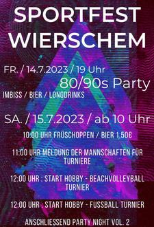 Die Sportler des FC Wierschem möchten am 14.07. und am 15.07.2023 auf dem Sportplatz zum Sportfest einladen.