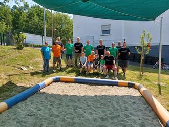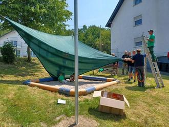 Auch die Stadt Polch beteiligte sich an den Anschaffungskosten. Des Weiteren wurde der Aufbau von den Mitarbeitern des städtischen Bauhofs bereits gut vorbereitet, denn sie hatten die Bodenhülsen bereits 14 Tage vorher betoniert, so dass wir alle direkt das Sonnensegel mit den Pfosten aufbauen konnten. Hierbei unterstützen die Mitarbeiter des Bauhofs, Egon Geisen und Simon Sauer, die freiwilligen Helfer- und Helferinnen aus Ruitsch.