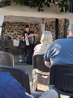 Ein milder Sommerabend lockte am Sonntag den 2. Juli viele Zuhörer zu einer musikalischen Reiseerzählung auf den Platz vor der Synagoge in Münstermaifeld. Mit Søren Thies und seinem Akkordeon konnten sie den Klezmermusiker Mosche auf seiner Suche nach einem besseren Leben begleiten. Aus der Armut eines Schtetls bei Odessa in die Lebensfreude des Paris der Belle Époque führten die Lieder und Erzählungen Søren Thies und die Gäste. Klezmer und Musette, volkstümliche Musik in Jiddisch und Französisch, fanden sich zu einem Reigen, der die Besucher begeisterte.