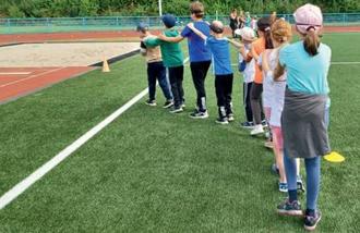 In der Olympiade traten insgesamt 12 Gruppen an, bestehend aus den Vorschulkindern und den dazu gehörigen Patenkindern aus der 3. Klasse. Begleitet wurden die Gruppen durch gemischte Erwachsenen-Zweierteams aus Kita, Grundschule und Elternschaft. Nachdem die Kita-Sozialarbeiter*innen Benjamin Franz und Lea Becker gemeinsam mit Grundschulleiterin Claudia Degen und Grundschulsozialarbeiterin Carolin Degen den Startschuss gegeben haben, konnte die Olympiade beginnen: Jede Gruppe startete mit einem musikalisch untermalten Warm-Up, das durch die Patenkinder angeleitet wurde.