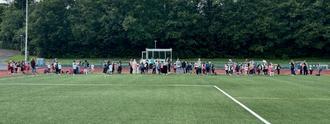 08:30 Uhr - 18.06.24 - Ochtendung. Eine bunte Menschentraube aus 120 Kindern und Erwachsenen schlängelt sich gemächlich aber bestimmt durch den Eingang des Stadions. Das Ziel ist der Rasenplatz mitten im Stadion, wo die Kinder sich bunten Tierschildern zuordnen: „Ich bin ein pinkes Schweinchen, ich ein rotes Kamel und ich eine blaue Qualle! Wo sind die Zebras!?“ hört man einzelne Kinder aufgeregt rufen. Dabei handelt es sich um die Vorschulkinder aus den vier Kitas in Ochtendung und die Drittklässler*innen der Grundschule St. Martin, die alle gemeinsam gespannt darauf warten, dass die Schulkind-Olympiade beginnt.