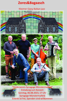 Der “Förderverein Synagoge Münstermaifeld“ lädt am Sonntag, 06.08.2023, 17 Uhr, zu einem Konzert ein. Zores&Bagaasch nennt sich eine Gülser Kapelle, die sich der internationalen Folklore im moderneren Gewand verschrieben hat. Mit Akkordeon, Klarinette, Gitarre, Percussion, Bass und mehrstimmigem Gesang begleiten sie Lieder und Tänze aus ganz Europa und darüber hinaus.