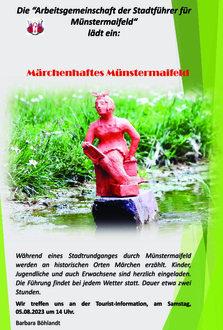 Um 14 Uhr startet „Märchenhaftes Münstermaifeld“ für Kinder, Jugendliche und auch Erwachsene. Während eines Stadtrundganges werden an historischen Orten Märchen erzählt. Treffpunkt ist jeweils an der Tourist-Information Maifeld im Rosengarten.