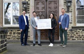 Das Ju+X-Team der Verbandsgemeinde Maifeld freut sich über eine Spende der „VR Bank RheinAhrEifel eG“. Die 3.000 Euro sollen die Arbeit und die Projekte des Ju+X-Teams unterstützen. Stellvertretend für alle nahmen Bürgermeister Maximilian Mumm und Katharina Gilsdorf, Schulsozialarbeiterin und Leiterin des BilBO-Projekts an der Grund- und Ganztagsschule St. Georg in Polch, den symbolischen Scheck aus der Hand von Dirk Wey (Direktor des Regionalmarktes MoselMaifeldPellenz) und Thomas Probstfeld (Filialleiter in Münstermaifeld) entgegen.