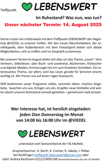 Allen hat es viel Spaß gemacht und Viele haben versprochen, auch beim nächsten Treffen dabei zu sein, bei dem wir das Thema Lesen weiter vertiefen werden. Unser Treffpunkt LEBENSWERT findet jeden zweiten Donnerstag im Monat, 14:00-16:00 Uhr im @Viedel statt. Nächster Termin ist der 14. August 2025. Wer dabei sein möchte, ist herzlich willkommen. Unser Motto: Gemeinsam statt Einsam.