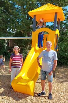Ortsbürgermeister Lothar Kalter bedankte sich anlässlich der symbolischen Übergabe des Spielgeräts bei der ehemaligen Vorsitzenden des Pfarrgemeinderats, Ulrike Hofmann, für die großzügige Gerätespende der Pfarrei „St. Martin“.