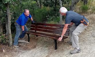 Josef Marx und Hermann Nördershäuser beim Wiederaufstellen der Bank auf „Kastesch Bersch“ am Traumpfad.