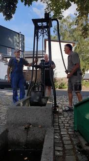 Anfang August 2022 war es dann soweit: Unter dem rhythmischen Klacken des neuen Schwengels, förderte die Pumpe zum ersten Mal seit fast 40 Jahren wieder Wasser, das in die Basalttröge plätscherte.