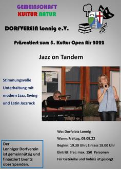 Nach dem 4. Open-Air-Event 22 bei fantastischer Stimmung und großer Nachfrage mit Schwerpunkt Pop und Rock, hat sich diesmal die Koblenzer Formation Jazz On Tandem zum Lonniger Open-Air-Kulturevent angesagt. Das Duo wurde 2015 von der Sängerin und Saxophonistin Cordula Kaiser und dem Pianisten Dieter Frank gegründet. Auf seiner musikalischen Reise durch den traditionellen und moderneren Jazz hat das Duo auch Swing, Latin Jazzrock im Gepäck, die es in fantasievollen Arrangements mit aparten Soloimprovisationen interpretiert.