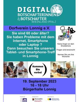 Die Digitalbotschafter des Landes Rheinland-Pfalz bieten einen neuen Treffpunkt in Lonnig zum Austausch und zur Hilfe bei der Nutzung des Internets mit passenden Angeboten, die auf ihre speziellen Lernbedürfnisse und Herausforderungen im Alter zugeschnitten sind. Wir möchten gemeinsam die digitalen Herausforderungen annehmen, kritisch hinterfragen und meistern.