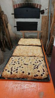 Kurz nach Mittag kam der Streuselkuchen in den Ofen; auch er ließ keine Wüsche offen. Am Abend wurde nochmals nachgeheizt, jetzt kam die Pizza in den Ofen. Freundlicherweise hat uns Maria und Benno Krechel in Ihrem Hof bei dem regnerischen Wetter Unterschlupf angeboten. Dort konnten alle Beteiligten, die an der Verwirklichung Projektes Backes beteiligt waren, trocken sitzen und die ersten Erzeugnisse des Backes genießen.