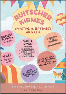 am 13. und 14. September 2024 können wir in Ruitsch unsere traditionelle Kirmes feiern. Eine Veranstaltung, auf die sich die Dorfgemeinschaft und insbesondere unsere Kinder sehr freuen.