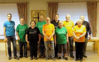 Brudermeister Hubert Mohr (hinten: 1. v. r) und Projektpate Jürgen Schneider (1. v. l.) freuen sich mit den Vereinsmitgliedern der St. Sebastianus Schützengilde 1868 Kalt e. V. über den neuen Fußboden in der Schützenhalle. (Foto: Westenergie)